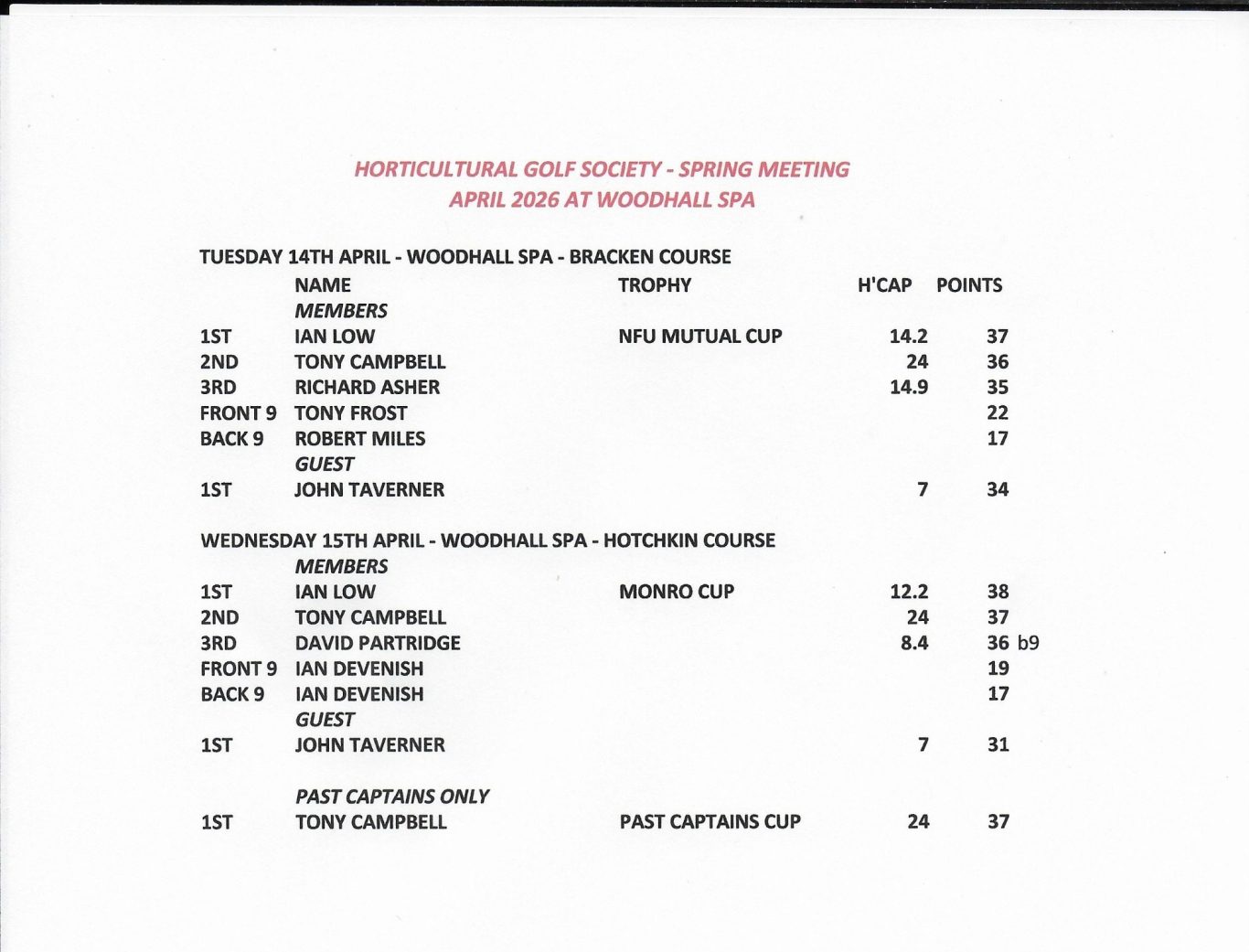 HGS first meeting of 2026 was held, as usual, at Woodhall Spa on 14th and 15th April 2026. We played the Bracken course on Tuesday and the Hotchkin course on Wednesday The 96th AGM was held on Wednesday at Woodhall Spa GC where Simon Partridge was installed as our Captain for 2026. A very pleasant evening was held at the Inn at Woodhall Spa hotel on Tuesday evening, where the current Captain and incoming Captain elect gave their speeches rather than at AGM.